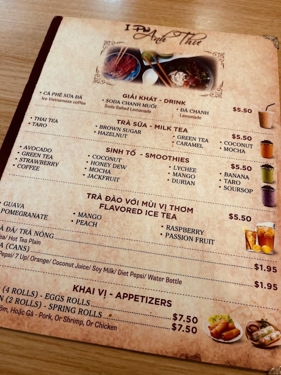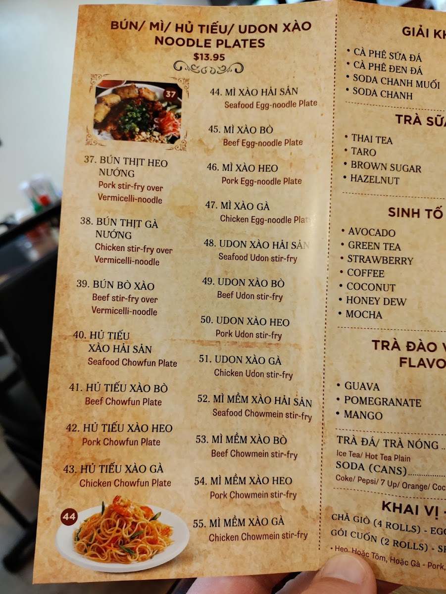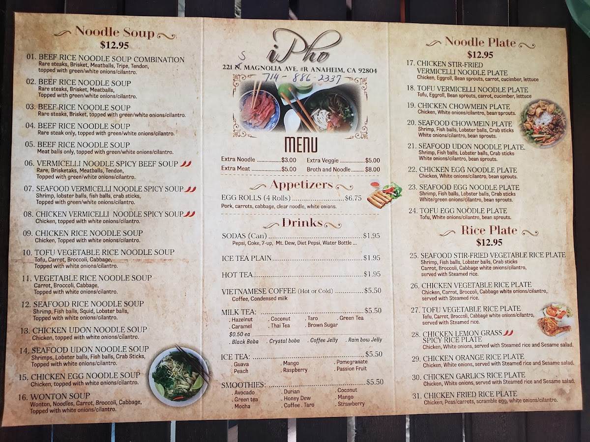 From a reviewer’s perspective, the menu at Ipho Anaheim, located at 221 S Magnolia St R, Anaheim, CA 92804, offers a well-rounded and comforting snapshot of Vietnamese cuisine, with a strong focus on variety and familiarity. The heart of the menu clearly lies in its pho selection, where diners can explore classics like Combo Beef Noodle Soup, Phở: Tái, Vè Dòn, Bò Viên, Phở: Gầu, Bò Viên, Phở: Sách, Tái, and Phở: Gầu, Tái, each catering to different preferences for beef cuts and textures. Beyond pho, the restaurant expands its noodle offerings with flavorful stir-fried and dry noodle plates such as Mì Xào Hải Sản, Mì Xào Bò, Mì Xào Heo, Bún Thịt Heo Nướng, and Bún Thịt Gà Nướng, giving guests satisfying alternatives to soup-based dishes. The menu also includes comforting bowls of Hủ Tiếu Đặc Biệt, Hủ Tiếu Rau, Hủ Tiếu Hải Sản, Hủ Tiếu Dai, Heo, and Hủ Tiếu Dai, Hải Sản, as well as heartier options like Cơm Chiên Gà, Cơm Chiên Tôm, Cơm Bò Xào Sả Ớt, and Cơm Hải Sản Xào Rau. To start a meal, the simple yet classic Gỏi Cuốn makes for a refreshing appetizer. Rounding everything out is an extensive beverage menu, from traditional drinks like Cà Phê Sữa Đá, Soda Chanh Muối, and Đá Chanh, to indulgent choices such as milk teas (Thai Tea, Taro, Brown Sugar Hazelnut, Green Tea), smoothies (Avocado, Green Tea, Strawberry Coffee, Coconut), and fragrant fruit teas including Guava, Pomegranate, and Mango, served hot or iced. Overall, the menu at Ipho Anaheim feels thoughtfully curated, balancing traditional Vietnamese staples with approachable variety, making it a reliable choice for both first-time visitors and returning diners looking for comforting, familiar flavors.